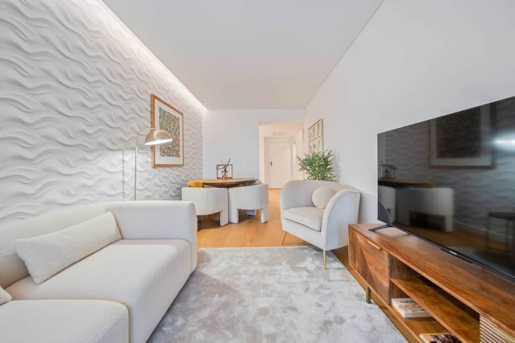 O apartamento dispõe de duas elegantes suítes, ambas com casa de banho privativa, acabamentos premium e roupeiros embutidos, oferecendo o máximo de privacidade e comodidade. A sala de estar, com janelas do chão ao teto e varanda espaçosa, convida a refeições ao ar livre, num ambiente sofisticado e acolhedor.